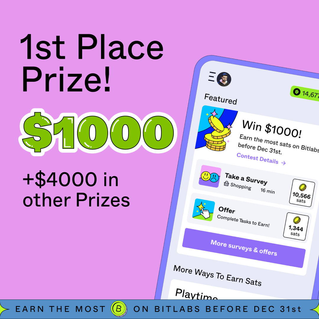 Engage with the ZBD App by taking surveys or completing offers on Bitlabs, and with each action, you'll rack up 'sats'—the smallest unit of bitcoin. Think of them as digital cents to bitcoin’s dollars. Top the earnings chart by the end of the contest, and a substantial bitcoin prize is yours.