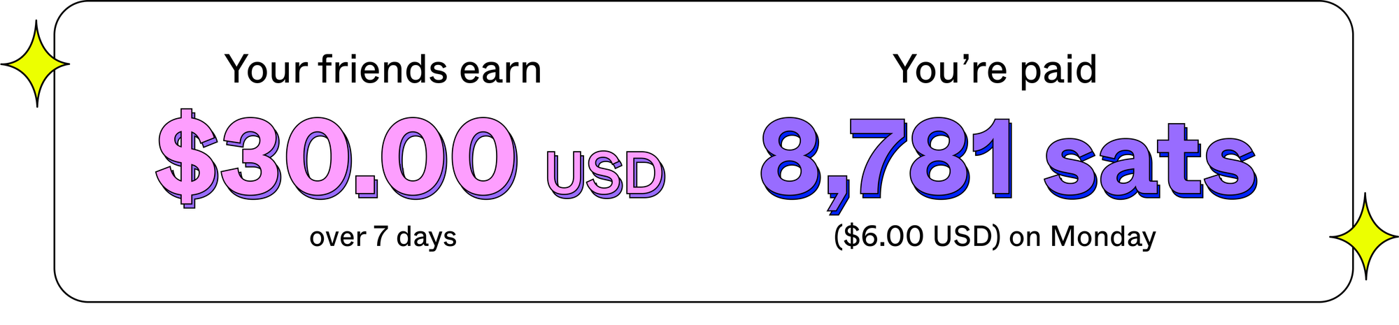 You’ll be paid the sum of day 1 to day 7 earnings in USD divided by 20%. We’ll then convert the total sum from USD to sats, based on the price of BTC at the time, and deposit those sats in your ZBD wallet.