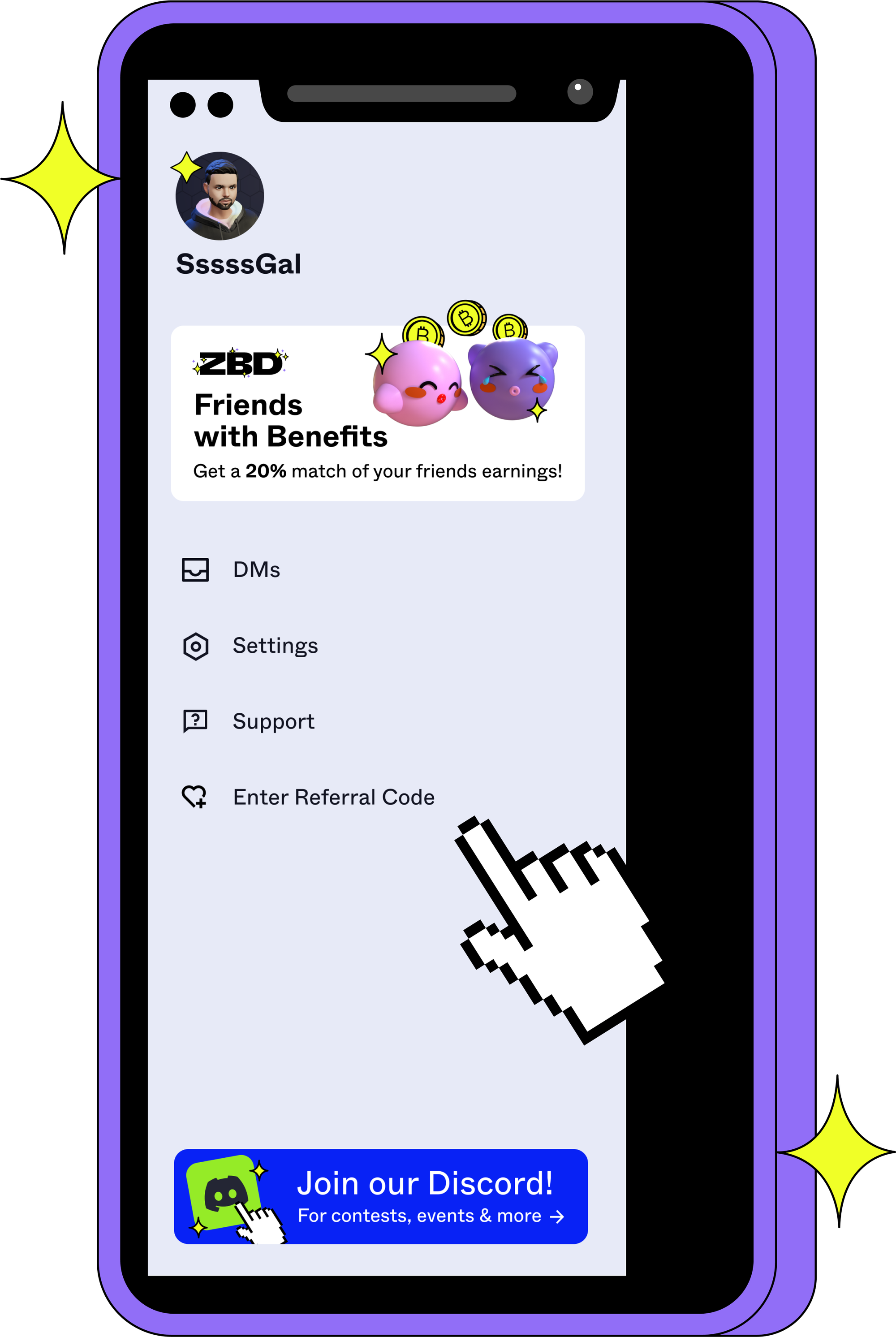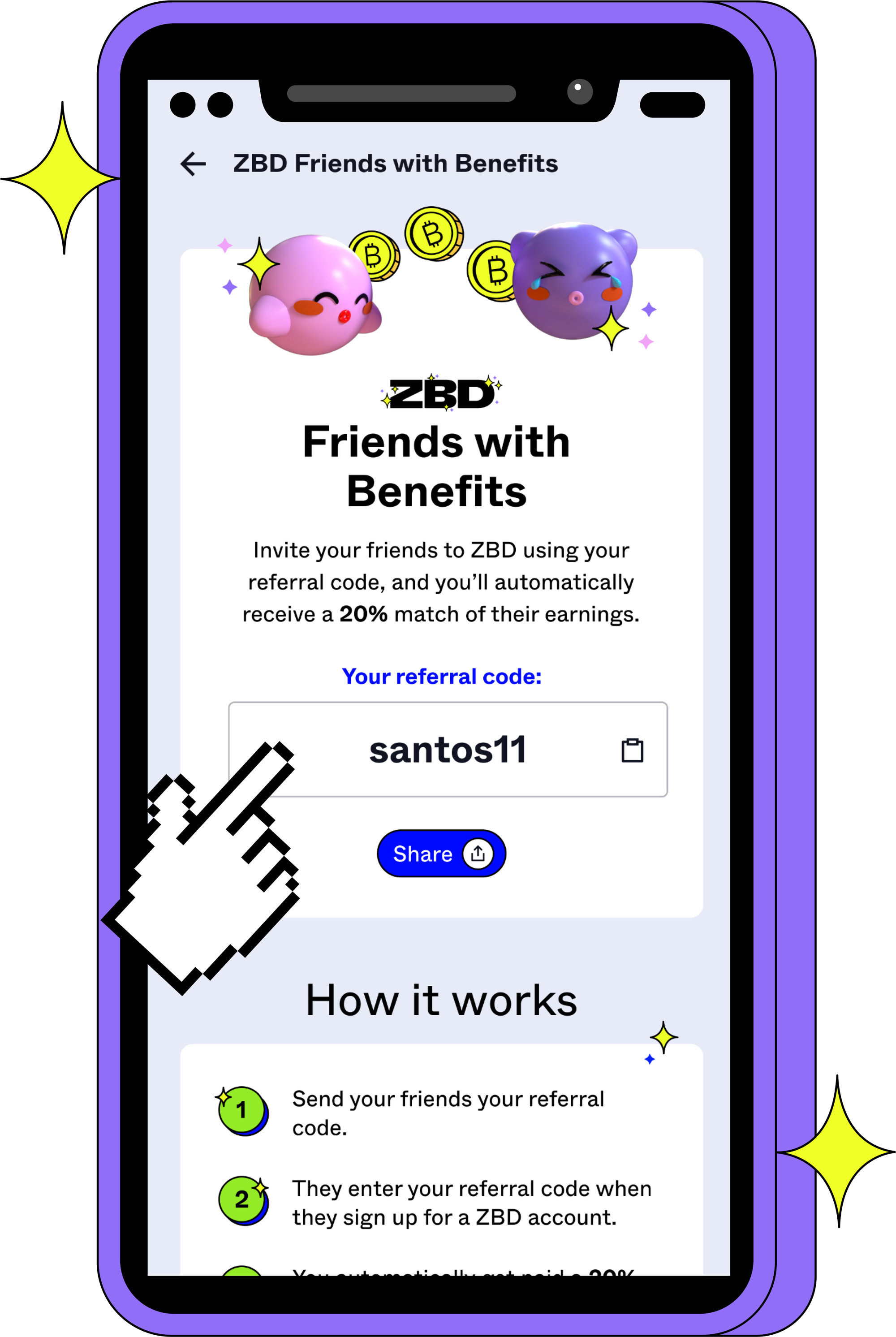 ZBD Friends with Benefits is our referral program. Simply invite your friends using your personal referral code, and you’ll earn a 20% match of their earnings for a full year.